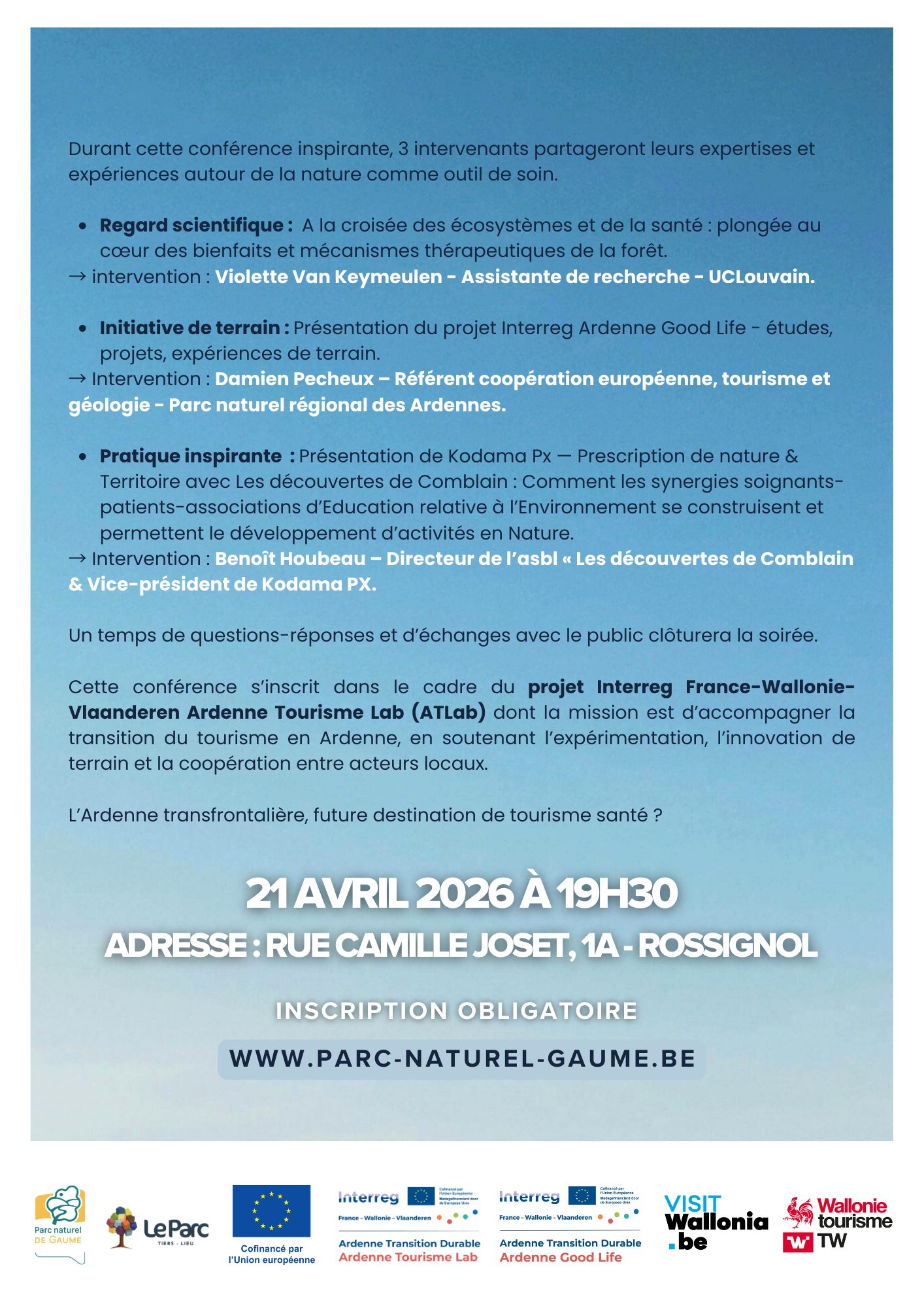 Cette conférence s’inscrit dans le cadre du projet Interreg France-Wallonie-Vlaanderen Ardenne Tourisme Lab (ATLab) dont la mission est d’accompagner la transition du tourisme en Ardenne, en soutenant l’expérimentation, l’innovation de terrain et la coopération entre acteurs locaux.